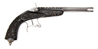 *HIGHLY EMBELLISHED, GOLD AND SILVER INLAID, MAUSER C96 MODEL 1930 PISTOL WITH CASE. SN 736298. Cal. 7.63. 5″ Barrel. Standard configuration. Finely inlaid in silver and gold at about 90% coverage of open arabesque scroll with engraved floral highlights. All factory markings are gold filled, and two headed fowl is gold inlaid over crescent shaped floral engraved devices on each side. A circular monogram is gold inlaid on left magazine housing. Nicely finished ivory grips have central floral raised carving. Pistol is housed in its original black morocco leather covered wooden case lined in royal blue velvet, with “La Portena” Buenos Aires label, and contains an ivory knobbed cleaning rod. CONDITION: Excellent, appears nearly unfired, with only slight silvering on sharp edges of rust blued and tempered blue parts. Grips are excellent. Mirror bore. Case has considerable loss of leather on exterior. Interior cloth is very fine, with normal compressions from pistol. 4-47268 MGM173 (2,500-5,000)