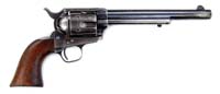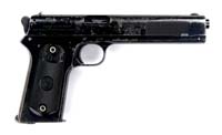 *FINE A.F. STOEGER AMERICAN EAGLE LUGER. SN 7306. Cal. 30 LUGER. Standard 3-7/8″ tapered bbl made by DWM for A.F. Stoeger Inc. of New York with spread winged American eagle over chamber area. The “A.F. STOEGER INC., NEW YORK” stamping is along the right side of receiver. Has dark, full checkered original grips with modified, unnumbered wooden bottom magazine. Rear grip area is slotted and notched to accept a shoulder stock. CONDITION: Very fine. Bluing is 95-98% with wear on high part of sideplate and sharp edges of frame. All colored metal parts retain 90-95% of their bright straw colors. All visible serial numbered parts are matching. Mechanics are crisp. Bore is bright. 4-33514 BT90 (3,000-5,000)