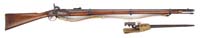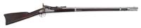 READ & WATSON TYPE II RIFLE. SN Not noted. Cal. 64. Mr. Michel describes this rifle as follows: “Now known to be the product of N. T. Read and John J. Watson of Danville, Virginia, using rifles and carbines which had been supplied under the Militia Act to the state of Virginia prior to the outbreak of the war, these rifles represent an unusual conversion from breechloader to muzzle loading arm, instead of the more usual reverse. The Type II variation of this rifle has a breech piece of brass cut significantly larger than that of the Type I. This breech piece is bulky, with a heavy rearward extending tang which covers the top of the wrist of the stock and the top front part of the comb of the stock. The serial number is a Roman numeral in the bottom of the brass breech piece and a letter in conjunction with an Arabic number on the curved forward face on the bottom of the breech piece”. Type II Read & Watsons are quite scarce with the large, brass breeches. You are bidding on a nice example of this rarely offered rifle with an accompanying, correct Hall bayonet. Mr. Michel’s Notes State: “Now known to be the product of N. . Read and John J. Watson of Danville, Virginia, using rifles and carbines which had been supplied under the Militia Act to the State of Virginia prior to the outbreak of he war, these rifles represent an unusual conversion from breechloader to muzzle loading arm, instead of the more usual reverse. The Type II version of this rifle has a breechpiece of brass but significantly larger than that of the Type I. This breechpiece is bulky with a heavy rearward-extending tang which covers the top of the wrist of the stock and the top front part of the comb of the stock. The serial number is a Roman numeral in the bottom of the brass breech piece and a letter in conjunction with an Arabic number, a Roman numeral, or other letter on the curved face of the bottom of the breechpiece.” PROVENANCE: Ben Michel collection. CONDITION: Bbl and other iron parts are gray with scattered areas of staining and pitting. Old Harpers Ferry “NWP” inspector mark visible on breech. Stock is sound, with numerous dings, dents. Several chips to ramrod channel. Stock retains some varnish. Brass breech has nice patina over scratches and dings. 4-31304 JS120 (12,000-15,000)