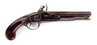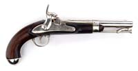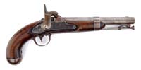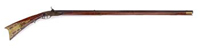 DICKSON, NELSON & CO RIFLE. SN NSN. Cal. 54. This Confederate copy of a Mississippi rifle was made in Dawson, GA, in 1865. Lock is marked forward of hammer “Dickson / Nelson & Co / CS”. Rear of hammer is marked “ALA / 1865”. Bbl is not dated but is stamped internally with a small “G” and a large “R” near breech plug. Murphy and Madaus in their book Confederate Rifles and Muskets stated, “There are no external stampings on the barrels. The internal surface of the lockplate is unmarked. The under surface of the barrel of many specimens studied is stamped with a small ‘G’. The significance of this marking is not known at this time, but it probably is the initial of one of the workmen who inspected finished arms at the plant”. Like other guns of this manufacture, gun exhibits brass buttplate, trigger guard, nosecap, and clamping bands. Gun appears orig and complete in every regard, with possible exception of replaced front sling swivel. Ramrod appears orig to this gun, though of foreign manufacture. Mr. Michel, in his notes, states that this gun was cataloged by Robert Abels in his catalog #34. This gun was item #6. CONDITION: Bbl is gray, cleaned and pitted, especially at breech. Lock is gray and smooth. Markings are clear. Brass buttplate, trigger guard, bands, and nosecap are smooth with nice patina. Stock is sound with scattered dings, gouges, scratches. Repaired hairline crack in front of lock and about a 1″ piece of wood replaced behind bolster. 4-31300 JS133 (18,000-25,000)