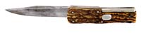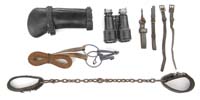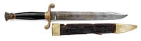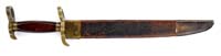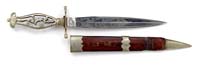 RARE MODEL 1937 ITALIAN HIGH RANKING OFFICER’S DRESS DAGGER WITH MUSSOLINI CONNECTION. The knife has an unmarked 7-3/4” x 7/8” flat ground upside down mounted blade with 4-3/4” back grind. Handle is aluminum with a hooked one-side hand guard with dbl-sided eagle pommel and gutta percha panels with a brass fasces on left side (Roman symbol of authority). Accompanied by its orig, black painted, metal scabbard with gold washed throat, hanger bands & tip and a gold washed chain with a large stylized “M” at top and belt clip with Italian eagle having a black enamel background perched on a bar marked “SPQR”. This dagger was purchased by the consignor in about 1962 from Jacabus Ten Berge while they were both employed at The Record newspaper in Hackensack, NJ, Mr. Ten Berge was the editor and consignor was employed as a printer. Consignor states that Mr. Ten Berge was an officer in WWII and Korea who greatly resembled Ernest Hemingway. Consignor states that Mr. Ten Berge related to him that in April or May of 1945 he was in Milano, Italy when the bodies of Mussolini, his girlfriend Clara Petacci & Gen. Achille Starace, Mussolini’s aide who had been Secretary of the Fascist Party (1931-39) were brought into the city square. Mussolini and fourteen others had been executed elsewhere and brought to an Esso gas station in Milano. Gen. Starace was discovered hiding in Milano and executed on the spot and he, along with Mussolini & five others, were hanged, upside down from a steel girder in front of the gas station. He stated that Communist partisans armed with machine guns forced Mr. Ten Berge & his driver-photographer to the ground and were about to kill them when a village priest ran out of the church yelling “Americano, Americano” and interceded, saving their lives. They were released and Mr. Ten Berge went over to look at bodies and removed this dagger from Gen. Starace’s body. Consignor states that he purchased the dagger from Mr. Ten Berge in about 1962 and was given a number of photographs from that day in 1945 but, unfortunately, has misplaced them. CONDITION: Very fine. Blade retains virtually all of its orig polish or plating, whatever the case may be. Handle is oxidized aluminum, somewhat dull, with gutta percha panels which are in fine condition. Sheath has nicks & scratches with tip retaining most of its orig gold wash with traces of gold wash on other parts. The chain, the “M” and belt clip retain most of their orig gold wash. 4-32903 JR628 (3,000-5,000)