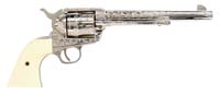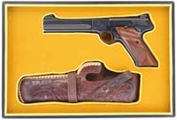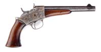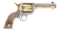 RARE ENRAVED REMINGTON TYPE III MODEL 4 SUPERPOSED DERRINGER SN L91118. Cal. 41 RF Rimfire. Usual configuration with 3” bbls having a distinct rib, marked on top “REMINGTON ARMS—U.M.C. CO. ILION, N.Y.”. It is silver plated with gold wash and has fine, light foliate & floral arabesque pattern engraving with smooth homemade walnut grips and its orig checkered hard rubber grips that have had the escutcheons removed and installed into the wooden grips. Accompanied by a small brown belt holster. CONDITION: Very good. Retains strong gold wash on sides & back of hammer, on extractor, sides of trigger & inside opening lever with traces of gold wash over most of frame with balance exposed silver and some light wear around muzzles. Back strap is moderately flaked. Grips are sound. Mechanics are fine, bright shiny bores. 4-59745 JR591 (2,000-3,000)