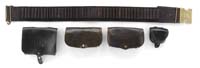 *LOT OF WWII NAZI HAND GUNS, PINS & BADGES SN 825074 & 485335. This lot consists of a rare Walther PPK with “RZM” marked slide, a Sauer Model 1938, three belt buckles and a box of nine pins & badges including an iron cross and two silk ribbons. Also included is a “WELCOME / HOME / OUR HEROES” banner and the war trophy paper of the soldier who brought it all home from the war. 1) Walther PPK. Cal. 7.65 mm (32 ACP). SN 825074. It is blue finished with 3-1/4” bbl, with usual markings on left side of slide but also has the very rare “RZM” party leader’s mark. Fitted with mottled brown gutta percha grip with matching finger rest bottom on magazine. Accompanied by an orig brown leather flap holster with an orig spare magazine in pouch. It has maker’s name and address with a Nazi eagle along with the model of pistol stamped in ink inside flap. Hand written in ink is “H. DS / A4555”. No indication what this stands for but it probably is the orig owner’s initials. 2) Sauer & Sohn Model 1938 Semi-Auto Pistol. Cal. 7.65 mm (32 ACP). SN 485335. Blue finish with 3-3/8” bbl, black hard rubber grips with Waffenampt & eagle “N” proof marks are the only marks on pistol except caliber. It has rough wartime military finish. Accompanied by an unmarked soft, brown leather flap holster. 3) Three Nazi belt buckles. a) Aluminum with pebble finish & an applied rnd medallion with oak leaves & acorns around bottom “GOTT MIT UNS” around top & a swastika in center. b) A stamped sheet brass buckle with applied white metal medallion with oak leaves & acorn around bottom & Nazi eagle in center & top. c) A stamped nickeled brass buckle with a large brass lightning bolt on face & inside marked “M4 / 34” with “RZM” stamp. 4) The medals, pins & badges consist of an iron cross dated “1939” with hallmarked silver backplate & pin, a WWI service medal missing ribbon, an oval brass medal with ribbon ring in top having the Nazi eagle over crossed sword & shovel over a pillbox on front and marked on back “FUR ARBEIT ZUM SCHUTZE DEUTSCH LANDS” with an oak leaf border, a small aluminum Nazi eagle with folding clasps on back, three small pot-metal pins with Nazi eagle on front and date “1942” at bottom, two small red, white & black enameled “NSDAP” round pins with the “RZM” mark at top on back with “M1 / 93” at bottom. Also accompanying are two medal ribbons, one gold colored with white stripes at each edge and other red, white & black. 5) An oil cloth, red, white & blue banner, 13” x 9” with a large white star marked “WELCOME HOME” with an American shield below with panels on each side marked “OUR HEROES”. The top point of star is hand marked “27 DIV.”. It has two small grommets in top edge for hanging in a window. 6) Finally accompanying is the war trophy certificate dated 13 November 1945. It lists the Walther pistol with other small items, which were brought back from a GI in WWII. CONDITION: 1) Very fine. PPK pistol retains about 95-96% strong orig factory blue. Grip has a couple of scratches and what may be a hairline on right side, otherwise is sound with light wear. Mechanics are crisp, bright shiny bore. Holster is very fine showing light wear & soil. 2) Sauer pistol extremely fine. Overall retains about 92% strong orig blue with slight muzzle edge wear & some flaking on back strap. Mechanics are fine, brilliant shiny bore. Holster is sound with moderate soil & wear. 3) All three buckles are fine. 4) All pins & badges seem to be in fine condition except one of the “NSDAP” pins which has some minor damage on one edge. 5) Banner colors are vivid & bright with some light soil. 6) As is. 4-32591 JR496 (3,000-5,000)
