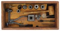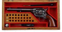 SCARCE ERMA STYLE LUGER SMALL BORE CONVERSION KIT. SN 6362. Cal. 22 LR. Housed in its orig birch wooden casing with recesses in bottom for breech block & complete toggle, a 22 caliber bbl with spacer & tension nut and an aluminum base magazine. One small tool is missing. CONDITION: Very fine to extremely fine. Overall retains virtually all of its orig factory blue with some minor wear on top of toggle and back edge of magazine. Box is fine with old stain on top. Brilliant shiny bore. 4-59638 JR616 (400-700)