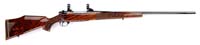 *OUTSTANDING CUSTOM GRADE WEATHERBY BOLT ACTION RIFLE SN H209246. Ca. 340 WM. #2 contour 26″ bbl high luster blue, checkered bolt knob damascened bolt and follower, engraved trigger guard and floor plate with gold bear. Fancy walnut with rosewood forend tip and grip cap. #11 intertwined ribbon carving. CONDITION: Very fine. Gun has been fired but with the exception of a few light finish marks and the absence of the Buehler scope mounts it is like the day it was received in 1990. Comes with factory certificate stating ship date of June 27, 1990. Gun comes with 32 rounds of factory 250 grain round nose soft point, 20 round of 250 grain nosler, 18 rounds of 210 grain soft point nosler, and 20 rounds of 200 grain soft point factory ammo. 4-32613 BT30 (3,000-6,000)