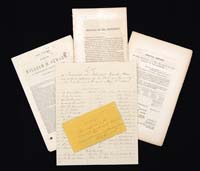 EXTREMELY RARE UNDOCUMENTED WINCHESTER LEE NAVY STRAIGHT PULL RIFLE FROM THE U.S.S. MAINE. SN 8911. Cal. 6 mm Lee Navy. Standard Lee Navy with 28” tapered rnd bbl, square base front sight with two bbl bands, the front of which has a bayonet lug & stacking swivel. It has a short handguard with a sling loop on bbl band and has a 2,000 yard ladder rear sight. There is a sling loop in the butt. Left side of buttstock is very beautifully & tastefully carved “U.S.S. MAINE” and right side of stock by receiver and up forestock is carved & filled with red paint “From U.S.S. MAINE, Feb, 17 1898.” This rifle was salvaged from the Maine and brought aboard one of the ships on which Chief Petty Officer Thomas A. M. Chambers was serving. He apparently took the rifle for a personal possession and brought it home. Chief Chambers had enlisted in the Navy in 1886 and later deserted from his ship and subsequently re-enlised under the name of Alexander Thomas Meade and served through July, 1899 when he was medically discharged for disability. On March 29, 1899 he was given an unconditional pardon by President William McKinley, the original of which accompanied this lot. Also accompanying this lot are numerous other papers, three albums of family photographs including many Civil War & Indian Wars officers’ CDV’s in uniform, several Navy & Marine Corps badges & mementoes and buckles including an Indian Wars gold washed officer’s buckle and a sterling silver bosun’s pipe. Most convincing of the accompanying material is a large sepia tone photograph, 14” x 10-1/2” vertical image, of two young women seated in front of a fireplace. Behind them, hanging below mantle, is this very rifle which can be readily identified by the carving visible on left side of butt. Also visible is a twisted wire which is attached to bolt knob and is used as a hanger. Wrapped around the entire action is a silk cloth of some sort, the remnants of which still remain with rifle. Also included with this lot is Chief Chambers citizenship papers dated 17 October 1898 granting him citizenship and states that he was 36 years old and a native of Montserrat, West Indies. Also included is his retirement pension authorization from the Post Office where he was apparently employed. And finally accompanying is a 5’ x 8’ 45-star American fla CONDITION: Rifle is fine with receiver & magazine box a cleaned metal color with fine pitting. Bbl, bolt & buttplate are a dark smoked patina. Wood is sound, nice & light colored where the cloth covered it while hanging over fireplace. Fore & aft of the receiver are dark & smoked. Flag has a few moth holes. Photograph is somewhat yellowed & soiled with a couple of tears not affecting image. Albums & photographs are worn with loose covers. 4-32614 JR624 (5,000-8,000)
