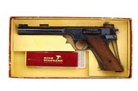 *WHITNEY WOLVERINE 22LR SEMI AUTO PISTOL. SN 34866. Blued finish w/4-1/2″ bbl and checkered brown plastic grips. Comes with one 10-rnd magazine. Produced from 1955 to 1962, it has a unique futuristic appearance. CONDITION: Very fine. Retains approx 90% orig blued finish. Bulk of wear at muzzle and along backstrap. 4-59629 CSW14 (200-300)