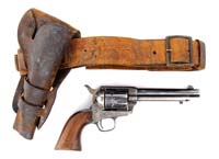 RARE SAN JUAN HILL DOCUMENTED MODEL 1896 KRAG CARBINE. SN 30571. Cal. 30-40 Krag. M1896 [receiver says 1896 only,this is a no model variation] carbine with 22″ tapered rnd bbl, proper 1896 carbine front sight, and original 1896 carbine rear sight graduated to 2,000 yards, properly marked with a “c” on the leaf as well as on the right side of the base. It has standard receiver markings with legible 1896 cartouche on left wrist. It has saddle ring and bar in left wrist. Mounted with nicely figured, uncheckered, 1-pc American walnut stock with proper M1896 carbine hand guard and grasping grooves with straight stock and smooth, steel buttplate with trap containing a 3-pc cleaning rod and nickeled oiler. Accompanied by a packet of information from Springfield Research Service indicating that this carbine was issued to Troop G, 1st Cavalry Regiment, between 1896 and early 1902. An inventory and inspection report dated May 27, 1901, indicates this carbine was on hand at that unit at Fort Yellowstone, Wyoming. Records further show “that Troop G, 1st Cavalry participated in the operations against Santiago, Cuba in the period June 22-July 17, 1898, including the famous capture of San Juan Hill on July 1. It can be assumed that this carbine was used during these actions”. CONDITION: Fine to very fine. Bbl retains 75-80% strong orig blue starting to dull with receiver retaining about 80% dull orig blue, sideplate about 80% dark case colors and gate 65-70% dark case colors with one area of chemical spotting. Wood is sound with 2 or 3 gouges on left side of stock and a series of small gouges on right side of wrist with other light handling and use marks. Overall retains a smooth, hand worn finish. Mechanics are fine. Strong, bright bore, frosty in grooves. 4-32898 JR155 (10,000-15,000)