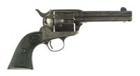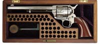 *COLT PEACEMAKER 22 SGL ACTION REVOLVER. Cal. 22/22 Mag. SN G139537. Blue & case colored with 6″ bbl, fixed sights & rampant Colt eagle black composition grips. Accompanied by its orig, wood grain, Styrofoam lined 1-pc box with spare cylinder, hang tag & papers. CONDITION: As new, possibly unfired. Retains virtually all of its bright orig factory finish to both blue & case colors. Mechanics are crisp, brilliant shiny bore. Box has one end flap detached & a tear on the same end, otherwise shows moderate wear. 4-57025 JR424 (400-700)