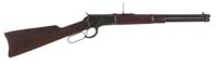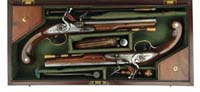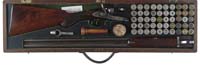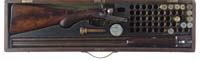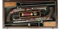 CASED ENGRAVED COLT NEW LINE 32 REVOLVER. Cal. 32 RF. SN 2853. Nickel & gold finish with 2-1/4″ bbl, 2-line address with fine bird head 2-pc ivory grips. Frame & bbl have about 70-75% coverage Neew York style engraving consisting of foliate arabesque patterns with punch dot background. Cylinder has been reguilded with the engraving re-cut through the finish. Punch dot background on the cylinder was not re-stamped. Accompanied by a rare orig walnut casing with purple velvet lining & a cartridge block containing 52 “U” head stamped cartridges. CONDITION: Extremely fine, all matching except the grips which are not numbered but fit extremely well & are probably orig to this revolver. Overall the frame & bbl retain 95-97% strong orig bright nickel. Trigger screw is slightly battered and all the screws retain most of their orig blue. Cylinder retains about all of the re-applied guilding. Grips have a lovely mellow patina. Good mechanics, bright shiny bore. Case has a minor hairline in the lid, otherwise is sound & retains most of its orig finish with light nicks & scratches. Interior is soiled with some wear in the bottom & lightly faded. Cartridges are fine. 4-56479 (4,000-7,000)