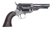 INSCRIBED E.A. PRESCOTT SGL ACTION NAVY REVOLVER. SN 77. Cal 36RF with a 7-1/8” oct bbl with a blued bbl and cylinder and silver-plated brass frame. This revolver is inscribed professionally and of the period down the back strap, “R. Heywood”. 6-shot revolver. 2-pc walnut grips marked across the bbl top “E.A. Prescott, Worcester, Mass./Pat’d. Oct. 2, 1860”. CONDITION: Fine. Gun retains most of its orig finish. Silver-plated frame and trigger guard are so deeply tarnished that they appear almost to be blued. Remains of powder residue on the frame. Grips retain about 80% of their orig varnish with some light nicks and scratches. Markings are clear, edges are sharp. This was a very popular private purchase handgun for Civil War officers. In depth research may lead to the positive identification of “R. Heywood” inscribed on the back strap of the revolver. 4-57249 CW85 (1,000-1,500)