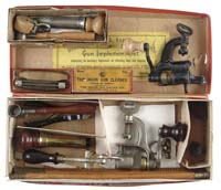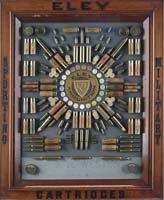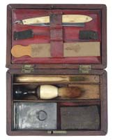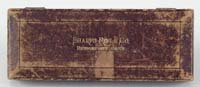 CASED PRESCOTT REVOLVER. SN 48. Cal. 32RF. 4” oct. bbl. Brass frame with “E. A. PRESCOTT. / PAT’D. OCT. 2. 1860” on top of bbl. Wood case is lined with red velvet and contains a partial box of UNC cartridges and a key, which works the loc.12 CONDITION: 20% blue on bbl and cylinder. 40% silver on frame. Case lid is cracked on one end and scuffed on the other. Interior is faded and stained. Cartridge box label is bright the cartridges are corroded. Mechanically fine. 4-56937 FS9 (800-1,200)