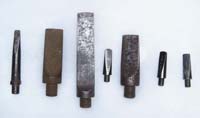 LOT OF 6 CHARLES PARKER TABLETOP WOOD AND CAST IRON COFFEE GRINDERS. 1) One # 555 all wood with metal handle and grinder. CONDITION: Very fine, label intact, shows light wear. 2) Two # 431. Wood body and base with cast iron top and handle. Both have orig labels. One mostly intact. One dark and chipped but legible. CONDITION: One shows light wear one shows moderate wear. 3) One small wood body grinder with flat metal handle marked only “C. P. Co.” with wooden knob. CONDITION: Shows heavy wear but appears functional. 4) Another about 13” tall with 4-1/2” square dovetailed body with cast iron top and handle with wooden knob. It has a wooden drawer in the base and the top is marked with the maker’s information. CONDITION: Very fine shows light wear. 5) Another one approx the same size with 5-1/8” square dovetailed body with an unmarked cast iron top and has a door on the bottom with articulated arm that when opened exposes the catch container. CONDITION: Fine plus. Shows light to moderate wear. 5-60522 JR804 (500-800)