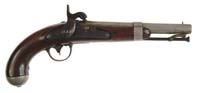 SHARPS MODEL 1C FOUR BBL PISTOL. SN 50 Marked “C.SHARPS &CO / PHILADA. PA.” in a circle around the hammer screw on the right frame. There is no marking on the left side of the frame. CONDITION: 80% bright blue thinning at the muzzle. 90% tarnished silver on the frame. Upper right cartridge head well on the breech is blown out. 80% flaky varnish on the grips. Action is fine. 8-87366 FS40 (1,000-1,500)