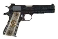 *ENGRAVED BERETTA MODEL 418 SEMI-AUTO PISTOL. Cal. 25 ACP. SN 97402A. Nickel finish with 2-3/8″ bbl, fixed sights with both thumb & grip safeties and Beretta logo, metal framed, hard rubber grips. The frame & slide have about 50% coverage fine foliate arabesque pattern engraving with the left rear side of the frame dated “1954”. CONDITION: Very fine. Overall retains 94-95% strong bright orig nickel with some flaking & spotting on the slide. Grips are fine, mechanics are fine, bright shiny bore. 4-57110 JR554 (300-500)