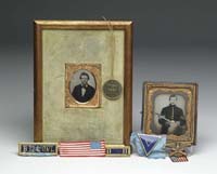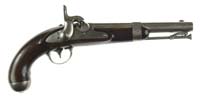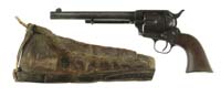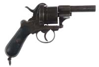 PIN FIRE REVOLVER WITH HISTORY. NVSN Cal 11mm. 3-½’ part oct bbl. Note wired to the pistol claims that this was a “French Pistol Taken From The Body of Rebel Officer. By Lt. N. Cooper in 1863”. This has a postmark dated 1883. There was originally engraving on the revolver but it is over half missing. Ejector and associated parts are missing. Bbl is cut off. CONDITION: Rust/brown patina with light to moderate pitting overall. Grips have been repaired, heavily filed and refinished. Missing some internal parts. 4-56885 FS28 (800-1,200)