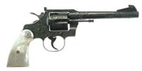 *COLT OFFICIAL POLICE DA REVOLVER. Cal. 38 Colt. SN 634911. Blue finish, 6″ bbl, fixed sights with checkered medallion walnut grips. CONDITION: Fine. Overall retains 88-90% strong bright orig blue with muzzle & sharp edge wear and a gray grip frame. Crisp mechanics, bright shiny bore. Roger & Gerald Wilde Collection 4-55374 JR349 (300-500)