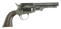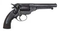 UNIDENTIFIED EUROPEAN PERCUSSION REVOLVER. NVSN. Cal. 36. 3-3/32” oct. bbl. Hammer lays flat on top of frame giving it an appearance of not having a hammer. Loading lever, loading lever catch and wedge appear similar to early Colt Paterson revolvers, but the multi-groove rifling is definitely European and the internal mechanism is similar to several European mechanisms. CONDITION: Frame and bbl have been heavily cleaned removing most of the engraving. Grips have been repaired and re-varnished. Mechanically appears to wor.12 4-56936 X-6 (400-600)