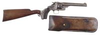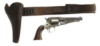 LOT OF FOUR PISTOLS ONE WITH HOLSTER. 1) Spanish copy of S&W revolver. Cal .38 S&W. SN66. 5” ribbed bbl. Pearl grips lightweight brown leather holster. CONDITION: Retains about 98% of the re-nickel the grips are missing small chips at the top, missing all springs and possibly other internal parts. Holster is scuffed and torn. 2) German Flobert parlor pistol. 5mm Cal. 8” part oct bbl. CONDITION: Retains about 80% blue on the bbl and nickel on the frame. Grips are good. Missing trigger spring and other parts. Mechanism is currently jammed in down position. 3) Moore Seven Shooter revolver. SN 3973. Cal 32RF. 5” oct bbl. Engraved frame. Replaced ejector and ejector catch. Heavily polished with nickel-plating overall the bbl markings have been removed. The backstrap is engraved “Corporal Geo. H Turner 10 TH Reg t N.Y.S.N.G. / from / Putman Hose Co. No.3 Albany Nov. 1862”. CONDITION: Retains most of the heavy plating and varnish on the grips. Mechanically good. 4) Hopkins & Allen X.L.D.A. SN 4991. Cal .32 RF. 3” oct bbl. CONDITION: 50% nickel mixed with rust. Grips heavily worn some parts frozen with rust. Pierre Renaud Collection 4-55744 FS19 (250-400)