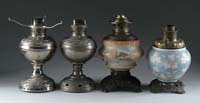 LOT OF SIX PARKER BANQUET LAMPS WITH TWO SHADES & EIGHT CHIMNEYS. (1) Cast metal base font, electrified with marble center with one loose decoration on font. Very good to fine. (2) Electrified kerosene lamp with cast filigree base & repoussed font with multi-color glass middle. Overall fine. (3) Cast filigree metal base with painted milk glass middle & repoussed font holder, electrified. Fine. The other three are all cast metal bases with repoussed fonts & one with an alabaster stem. All are still orig kerosene. Globes are reproduction, one being 9-7/8” diameter with painted roses & a frilly top. Other is Gone With the Wind style with three cherubs surrounded by silver decorations. Chimneys are standard clear glass kerosene chimneys. Generally fine, the wicks do not work. Two globes are fine & all eight chimneys are orig. CONDITION: As noted. 5-60541 JR819 (500-600)