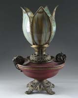 BRADLEY & HUBBARD GONE WITH THE WIND STYLE LAMP WITH METAL BASE. Fine urn shaped base about 12-1/2” high including the wick. It has a pierced cast metal base with bronze colored urn shaped bottom with applied acanthus leaf decorations & a repoussed font. It has a green globe shade & clear chimney with “ALADDIN” etching. CONDITION: Orig kerosene, appears functional & retains about 80% orig gold wash on the base, applied decorations top & font. Shade is fine. 5-60535 JR824 (150-250)