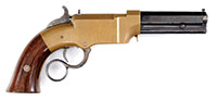 SN 38. Cal. 31. 3-1/2″ bbl. Blue finish. Gun metal receiver. Case colored hammer. Blue lever. 2-pc varnished walnut grips. Bbl shows 2-line address that reads “New Haven Conn. over Patent Feb. 14. 1854”. Because of the pristine condition and tightness of front-sight, which holds the collar in place, the collar was not removed to check for an assembly no. but it is absolutely certain that both parts are totally matching. Flats line up perfectly. SN is stamped on lower left side of grip frame and on upper inside of each grip. No other nos. were observed. Case is mahogany with a purple felt lining and is made for this model of pistol. CONDITION: Excellent. Bbl retains nearly all of orig deep-blue finish, with only very slight high point wear and muzzle wear. There is a hair line scratch across right side of bbl. Bbl mark is sharp. Bore appears unfired. Face of firing pin shows no evidence of firing. Receiver has a deep rich mottled mustard-brown patina with only the slightest handling marks overall. Sideplates fit perfectly. Rear-sight retains nearly all of fire-blue finish. Rear of firing pin retains nearly all of fire-blue finish. Elevator retains nearly all of fire-blue finish on sides of firing pin. Bottom of elevator also retains considerable fire-blue that has flaked slightly with 1 tiny scratch. Hammer shows most of its vivid trace color on either side, with a few small scratches on right side. Rear of hammer also shows vivid case color, as does the front face of hammer. Hammer face shows some use. Trigger has generous traces of case color and toned. Trigger spring shows nearly all of fire-blue finish. Lever retains most of its bright blue finish. Grips are fine with only a couple of small scratches and very slight high point wear. Case is exceptional. A truly excellent near mint condition example of New Haven Arms No. 1 Volcanic Lever Action pistol, 1 of only approximately 850 made. This is an opportunity for an advanced collector to add a specimen to his collection, that would be almost impossible to improve upon. 51096-3 (30,000-50,000) – Lot 1005