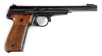 SN 7875. Cal. 22 LR. 7-1/2″ target bbl with multiple target weights attached. Blue finish overall with two piece thumb rest checkered target grips. Eagle N proofs. Target adjustable sights. 10 round magazine capacity. PROVENANCE: The Esteemed Collection Of Noted Expert And Author Warren Buxton. CONDITION: Very fine overall with slight finish loss at muzzle and high points. Grips are very fine with some exterior finish loss. Bore and mechanics are excellent. Weights have several small areas of abrasion, however not affecting the gun itself. 51569-171 TDW (800-1,200) C&R – Lot 3130