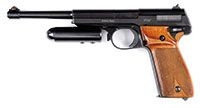 SN 1453. Cal. 22. 6-5/8″ bbl. Blue finish overall with checkered walnut stocks. 10 round magazine capacity. Hammerless design also known as the “Special Stoeger Model”. Developed after the 1932 Olympics but commonly retailed abroad. PROVENANCE: The Esteemed Collection Of Noted Expert And Author Warren Buxton. CONDITION: Very fine overall with bbl finish thinning and the possible addition of cold blue at one earlier period. Approximately 60% factory blue remains. Checkered walnut grips are good with typical bruises and some areas of checkering showing distress, however there appears to be no breakage or cracks. Bore and mechanics are excellent. 51569-154 TDW (1,250-1,750) C&R – Lot 3123