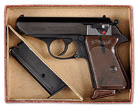 1) BERETTA 1915/19. SN 235651. Cal. 32ACP. 3-1/4″ bbl. Numbers matching slide, frame and bbl. Sheet metal “PB” marked grips, hammerless design, blue finish overall with slide having a somewhat purple/plum coloring. With flap holster that is unmarked, however is believed to be proper and correct. PROVENANCE: The Frank H. Wheaton, III Collection. CONDITION: Exceptionally fine with typical minor edge wear, with several small scratches in frame and slide, but nothing of major distress. Sheet metal grips are exceptionally fine and are rarely seen in this condition. Traditional Italian proof marks on left rear with a small “1929” stamped underneath that. Holster is very fine with sound stitching, leather is still supple, no visible markings. C&R 2) GALESI MODEL 6. SN 147219. Cal 32 ACP. 3-1/4″ bbl, full blue finish, 2-pc stippled plastic grips with Galesi monogram on top. Left side of the bbl is marked “Industria Armi Galesi-Brescia-Brev. Mod. 6”. SN is stamped on forestrap of frame. Last 2-digits of SN appear on inside of slide at rear. Italian proofs are stamped on left side of frame behind trigger and on slide above frame proofs. “1946” is also stamped behind trigger which is the year of manufacture. PROVENANCE: The Frank H. Wheaton, III Collection. CONDITION: Fine. Slide retains 90% bright blue finish with slight muzzle wear and some scratches. Markings are sharp. Model mark is lightly struck. Frame retains 80% blue with most of the loss on the grip straps. Markings are sharp. Grips are very good, intact with clear monograms. Magazine retains nearly all of the blue finish with some slight scratch marks. A fine example of a Galesi pistol made right after WWII. C&R 3) GALESI MODEL 9. SN 157692. Cal 32 ACP. 3-1/4″ bbl, full nickel finish with blue trigger and safety lever. Pistol is engraved overall in a vine motif. Left side of slide reads “Industria Armi Galesi Brescia-Brev. Mod. 9”, 2-pc plastic grips with stippled finish and Galesi monogram. SN is stamped on front strap. Last 2-digits of SN are stamped on inside of slide at the rear. Magazine is blue with a finger-piece style bottom plate. Pistol shows Italian proofs on the frame, behind the trigger with one proof on the slide above. “1949” is stamped with proofs which indicates date of manufacture. PROVENANCE: The Frank H. Wheaton, III Collection. CONDITION: Very good. Pistol retains most of the nickel finish. Engraving is sharp. Markings are sharp. Grips are very good, intact with clear monograms. An attractive Galesi Semi-automatic pistol. C&R 4) WALTHER PP. SN 144854P. Cal. 32ACP. 3-3/4″ bbl, full blue finish, checkered 2-pc plastic grips. Magazine has plastic grip extension. Left side of slide shows “WALTHER” banner, “WALTHER” 2-line address patent and Cal. mark, followed by “MOD PP”. Right side of slide shows “Eagle N” proof adjacent to the same proof on the breech of bbl. SN is stamped on right side of frame behind trigger. Forestrap is marked “R.F.V.17115 W”. PROVENANCE: The Frank H. Wheaton, III Collection. CONDITION: Fine. Slide shows 95% bright blue finish with some slight muzzle wear and a few scratches. Markings are sharp. Frame shows considerable blue that has drifted to a smooth plum/brown patina overall. Safety shows considerable bright blue. All markings are sharp. Grips are fine, intact with sharp checkering in logo. A very nice pre-war Walther PP. C&R 5) WALTHER PPK. SN 286074K. Cal. 32ACP. 3-1/4″ bbl, full blue finish, 2-pc checkered plastic grips with “WALTHER” banner. Left side of slide is marked with a “WALTHER:” banner, followed by a 2-line “WALTHER” address patent and Cal. mark. “MOD.PPK” is marked to the rear. SN is stamped on right side of frame behind trigger. Right side of slide below ejector port has an “Eagle/N” proof with corresponding proof at breech end of bbl. Magazine has “WALTHER” banner on right side above model and Cal. mark. PROVENANCE: The Frank H. Wheaton, III Collection. CONDITION: Fine. Slide retains 90% bright blue finish, turning somewhat plum toward the muzzle with a few light scratches overall. Markings are sharp. Frame retains a considerable amount of blue that is drifting to a plum/brown with some high point wear. Markings are sharp. Grips are very good, intact and show slight shrinkage. Magazine has most of the blue finish with some scratch marks, marking is clear. A nice pre-war Walther PPK. C&R 6) FRANZ STOCK POCKET. SN 33995. Cal. 32ACP. 3-1/2″ bbl. Blue steel construction with 2-pc Commercial Stock marked hard rubber grips. Hammerless striker fired design. Slide is marked “FRANZ STOCK-BERLIN CAL. 7.65”. Commercially finished with commercial magazine marked “FS” on base. PROVENANCE: The Frank H. Wheaton, III Collection. CONDITION: Fine with slight holster wear on front and leading edges of slide. Minor wear at front of trigger guard and high points of slide and rear sight. Grips are very fine. Bore and mechanics appear excellent by manual inspection. C&R 7) FN 1900 POCKET MODEL. SN 711032. Cal. 32ACP. 4″ bbl, full blue finish, 2-pc checkered hard rubber grips with “FN” logo picturing this pistol at the top of each grip. Left side of slide shows “FN” mark. Left side of frame shows “FN” logo over “BROWNING’S – PATENT” over “BREVETE – S.G.D.G.”. SN is stamped on the right side of the frame, right rear of the slide and right side of sight. Belgium proofs appear on the left side opposite the SNs. Magazine has “FN” mark on lower left side. PROVENANCE: The Frank H. Wheaton, III Collection. CONDITION: Fine. Slide retains 95% matte blue finish with muzzle wear, especially on left side as well as a few scratches. All markings are sharp. Frame retains 95% matte blue finish with slight edge wear and a few minor scratch marks. Grips are very good with clear logos and some minor abrasion on the checkering, especially on right grip. Magazine shows almost all of the blue finish with 