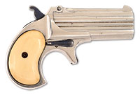 SN 540. Cal. 41RF. 3″ rnd bbls. Full nickel finish with 2-pc ivory grips. Bbl shows 1-line Remington Arms Company address on top rib. SN appears on left side of grip frame under grip, on bottom of bbl assembly, and on inside of left grip. PROVENANCE: Bruce Burtner Collection. Special Note: This item(s) contains plant or animal properties that may be covered by the Endangered Species Act (ESA). We have taken care to ensure that this item(s) meets the standard for sale under the ESA. However, certain states and other countries have laws that are more restrictive than the ESA. It is the bidder’s responsibility to ensure that it is lawful to purchase or transport this item(s) into their state, and to obtain the necessary import and export approvals. Delay or failure to obtain any such permit or approval does not relieve the buyer of paying for the item(s) and consummating the purchase. CONDITION: Very fine. This Deringer retains nearly all of the orig. nickel finish with only some slight mars and scratches overall. Bores are bright with strong rifling and appear unfired. Hammer, ejector, lever latch and trigger retain nearly all of their orig. blue finish. Grips are also very fine with a deep mellow patina and no chips or cracks. An opportunity to obtain a Remington Double Deringer that is rarely seen in this condition. 51641-17 TEP (1,250-1,750) ESA – Lot 2204