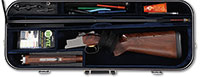 SN 09656ZX. Cal. 12 ga. 30″ bbl. 3″ chambers. Four 12 ga choke tubes. Full length matted top rib with white plastic center bead and custom red plastic front sight. Gold-plated checkered sgl selective trigger, auto ejectors, non-auto safety. Stock is full pistol grip checkered through wrist with adjustable comb. 14-3/4″ LOP over soft black “Inflex Technology” pad. Schnabel forearm checkered on sides with Deeley release. Polished receiver with oval pattern on sides and marked “Browning/725/Sporting” on bottom. Browning gold emblem on sides and trigger guard. This gun is housed in a steel Americase with blue velvet liner. Top side with Briley inserts, bottom with compartments for wrenches and other “goodies” enclosed. Weights with 28 ga inserts: 8 lbs. 13 oz. CONDITION: Excellent overall, showing light competitive sporting clays use retaining nearly all orig finish to both wood and metal with very light scattered handling marks. Case is excellent with minor handling marks and rubs. These are very high quality competition guns. 51393-9 JSL (1,800-2,750) – Lot 2468