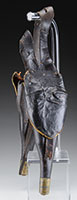 These rare holsters were made during the California Gold Rush, with California State seal embossed in flap and Indian shooting a bow and arrow embossed in body. This holster fits a small guard Model 1851 Colt Navy 4th Models with large trigger guards are too wide. This example is in beautiful condition with well defined decoration and original German silver muzzle cap. PROVENANCE: Dow H. Heard, Houston, Texas. CONDITION: Very good overall. Body retains excellent patina, well defined figure of Indian shooting bow and arrow, though worn at high areas, light scuffing. Flap shows California State seal of seated Eureka with bear standing by her feet. Flap, is heavily crazed and folded but embossed design is discernible and “EUREKA” is discernible beneath the seal. Closure tab is torn and reinforced with old leather and cloth, restoration to back of tab. 50412-91 (1,500-2,000) – Lot 1169