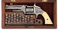 SN 6366. Cal. 32RF. Rare revolver with 3-1/2″ ribbed oct bbl, half-moon front sight and 2-line address with patent dates. Cylinder is unfluted with 5 chambers and revolver is mounted with smooth 2-pc ivory grips. Left side of buttstrap, under the grip is marked with the assembly number “E4″ with matching assembly number on rear face of bbl lug and front face of cylinder. Revolver is engraved in L. D. Nimschke-style, probably by the master himself with about 65-70% coverage beautiful intertwined foliate arabesque patterns that has very fine pearled background. Front flat of the top strap and correspondingly rear edge of bbl flat are engraved in mirror image half flower blossoms. Top of the backstrap and around the muzzle are engraved to match with geometric patterns down the backstrap and on the buttstrap. Cylinder has a full band of matching foliate arabesque patterns. Accompanied by an orig burgundy velvet lined mahogany casing, compartmented in the bottom for the revolver, a cartridge block in the left front with recesses for 40 cartridges containing 36 rds of 32RF short cartridges with mixed head stamps and a recess in the front edge of the cartridge block contains an orig Smith & Wesson steel cleaning rod. Also accompanied by a Smith & Wesson factory letter which identifies this revolver as being shipped Oct 25 1865 to James D. Brewer Hardware, Corner of Main & State Street, Springfield, Mass, as having a 3-1/2” bbl, engraved and ivory grips in a 2-gun shipment. James D. Brewer was born in 1819 and after finishing high school and working in Massachusetts, Ohio and New York City in various clerking positions as a 20 year old returned to Springfield and established the James D. Brewer Hardware Company. In 1836, Mr. Brewer along with various other Springfield luminaries, including Horace Smith founded the Chicopee Bank. Under the National Bank Act of 1865, with a capital infusion of $400,000 they incorporated the Chicopee National Bank. Mr. Brewer would serve as its first President 1865-1866 and Horace Smith would later become its President, 1887-1893. In 1846, Mr. Brewer incorporated the Springfield Water Power Company and in 1847 he incorporated the Springfield Gas & Light Company. In 1857, Mr. Brewer along with Homer Foote and Daniel B. Wesson incorporated the Springfield Safe & Trust Company. In addition to all of his other business interests, Mr. Brewer was the Chief Engineer of the Fire Department and Director of the Agawam Canal Company. He died in February 1886. Special Note: This item(s) contains plant or animal properties that may be covered by the Endangered Species Act (ESA). We have taken care to ensure that this item(s) meets the standard for sale under the ESA. However, certain states and other countries have laws that are more restrictive than the ESA. It is the bidder’s responsibility to ensure that it is lawful to purchase or transport this item(s) into their state, and to obtain the necessary import and export approvals. Delay or failure to obtain any such permit or approval does not relieve the buyer of paying for the item(s) and consummating the purchase. CONDITION: Very fine plus, all matching except grips which are unnumbered. Overall retains about 80% strong orig silver with losses from flaking, not wear. Engraving remains sharp and clean with only a few small scattered spots of rust. Grips are sound with a few minor age lines and show a golden ivory patina. Strong bright bore with a few spots of pitting. Case is sound with normal handling and storage nicks & scratches and retains most of its orig varnish. Interior is heavily faded with light soil and damage from the hammer spur. Ammunition is oxidized with tarnish on the copper cases. Altogether, a fine scarce revolver. 51820-3 (6,500-8,500) ESA – Lot 1174