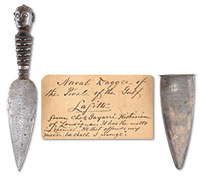How Charles Luzenberg owned this knife is unknown, however he, Lafitte and Gayarre were all contemporaries and the inscriptions and vintage of dirk are impeccable. There’s no more famous pirate in American folklore than ” The Pirate of the Gulf” Jean Lafitte, (1780-1823). Lafitte, in 1814, was held prisoner in a New Orleans jail, but not for long and his exploits in the Gulf continued until his death in 1823. Is it possible this knife was a souvenir from 1814 capture? The inscription on blade that is copied onto coin silver scabbard reads “QUIEN A MI DUENO OFFENDIERE DE MI LA VENGANZA ESPERE 1814” and translates “HE THAT OFFENDS MY MASTER, HE SHALL I REVENGE 1814”. The African figure carved horn grip with inset ceramic eyes, well made flower petal engraved capstan and forged bolster is in wonderful condition with a contemporary museum tag. Charles Luzenberg (1805-1848) was a prominent New Orleans surgeon who died only 4 months after this presentation to his friend Charles Gayarre (1805-1895) who wrote several 19th Century historical histories of Louisiana, including a history of Louisiana which was written the same year as this presentation and later is noted to have been the first biographer of Lafitte. No doubt, Lafitte had African’s among his crew which may explain the fine decorated spiral grip with silver pins and brass wire, with fine carved African tribesman’s head as pommel, which could have been a gift for their captain, Lafitte. Regardless, of history, there is no doubt that when displayed by Lafitte’s first biographer, he stated that this was the “NAVAL DAGGER OF THE PIRATE OF THE GULF LAFITTE…” CONDITION: Very fine. Overall length 7″. Early Spanish Colonial oval 3-7/8″ blade is worn, though details of etched motto, carriage scene and mounted horseman are discernible. Grip has good hand worn patina to horn. Iron patina to capstan, rivet and forged bolster, numerous silver pins are intact, as are twisted wire, apparent earrings that were worn by figure are missing as there are small holes in each earlobe. Paper tag is discernible and overall very good condition with foxing and acid burn. 50412-56 (15,000-30,000) – Lot 1251