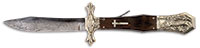 This knife originally in the iconic Vidalia, Louisiana Collection of Logan Sewell was made by the best known and highest grade New Orleans surgical tool maker Agrider Dufilho. This antebellum weapon has a presentation that reads “R. E. MCHATTON / FROM / M. O. LEBLANC”. LeBlanc was later a 2nd Lt. in the 13th Louisiana Infantry and Robert McHatton was a member of the Pointe Coupee Batallion Light Artillery who was paroled just after the Confederate surrender at Vicksburg. This knife shows old traces of gold paint typical of Union captured war relics displayed after the war. Knife is full firm marked with Dufilho’s logo of a scalpel stamped on opposite side. This exact knife is pictured on pg 420-421 of The Antique Bowie Knife Book by Adams, Voyles & Moss. Southern antebellum push daggers are quite rare and this is the only presentation of two Confederates we are aware. PROVENANCE: Ex-Logan Sewell Collection; Pgs 420-421 The Antique Bowie Book, Adams, Voyles, & Moss, 1990; Blade Magazine, August 2005. CONDITION: Very good to fine overall. 5-1/2″ blade including shank retains much of its orig polish and luster, overall stained and scratched. Double bar solid silver handle has grey/silver patina with small dents and scratches. Blade shank retains about half of its silver plate with spatterings of old paint. Firm mark and logo are discernible. Silver scabbard is missing frog button and finial, otherwise solid with easily discerned inscription with minor blemishes and overall silver patina. 50412-97 (15,000-25,000) – Lot 1250
