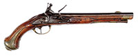 NSN. Cal. 70. 14″ overall, 8-1/2″ rnd bbl. Gun is iron mounted with brass blade sight on front band. Gun is totally unmarked with exception of rack number stamped in stock opposite lock. PROVENANCE: Private Lifetime Collection of A Noted Scholar And Authority. CONDITION: Gun is good to very good overall. Iron is mottled grey/brown with old cleaning. The lock internally has a rectangular cartouche with raised “PM” and bbl has indiscernible partial mark on bottom. Gun appears to be orig flint though hammer has welded repair and top jaw screw appears to be restored. Mechanically functional with smooth, slightly pitted bore with bright breech. Stock is sound and solid with a couple of hairlines and several small chips and other cosmetic defects. Nosecap is poorly fit to stock but patina matches other iron. 51627-4 JS (1,500-2,500) – Lot 3535