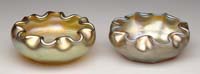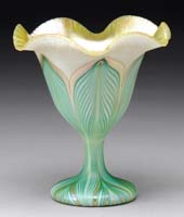 FOUR ART GLASS ITEMS Lot consists of two Baccarat pieces in Comet pattern; one tumbler and one powder jar missing it’s lid. The other two pieces are Tiffany flower frogs; one in gold Favrile and the other in opalescent pastel white. Both frogs have considerable damage and missing pieces. 5-65230 (100-200)
