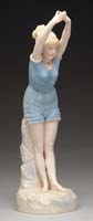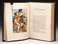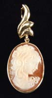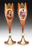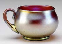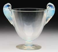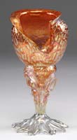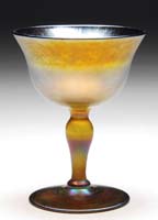 TWO CAMEO GLASS ITEMS 1) Rose bowl has classical cameo figures, acid carved against an acid textured background. Each cameo figure is finished with gold gilt. SIZE: 5-1/2″ t. CONDITION: Some minor gilt loss to cameo figures, otherwise very good to excellent. 2) Whiskey taster has single acid-cut rooster in amber glass against an acid textured background. SIZE: 2-3/4″ t. CONDITION: Small nick to underside of foot and some tiny fleabites to rim, otherwise very good to excellent. 5-63299, 5-63300 (200-400)