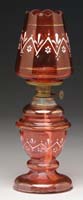 CRANBERRY MINI LAMP S1-460. Cranberry glass with white enamel decoration and gold banding. Foreign burner. SIZE: 9-1/2″ t. CONDITION: 3/16″ bruise on top outside edge of shade as well as mfg. roughness on both edges. Wear to decoration on both base and shade. Shade appears to be darker than base. 5-64237 (200-400)