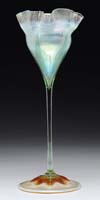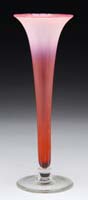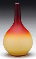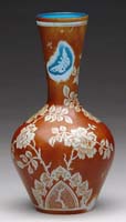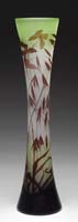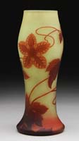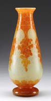 ARSALL CAMEO VASE With acid-etched decoration of burnt orange irises and leaves against a shaded pale peach to frosted background. Cameo signature near the foot rim “Arsall”. SIZE: 16″ t. CONDITION: Very good to excellent. 5-65165 (1,000-2,000)