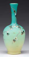 LEGRAS ENAMELED VASE Nicely decorated Legras vase features heavily enameled peacock below a spray of white flowers all done against a light green frosted background. Signed on the side in enamel “Leg”. SIZE: 12-3/4″ t. CONDITION: Very good to excellent with numerous bubbles visible in the glass inherent to the making. 5-65141 (200-400)