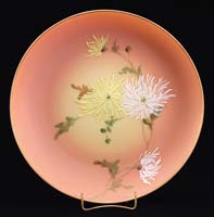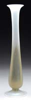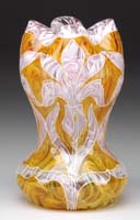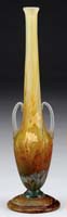 RICHARD CAMEO VASE Nice Richard vase has reddish-brown cameo leaves and flowers with very distinct veining against a soft yellow background. Signed on the side in cameo “Richard”. SIZE: 10-1/4″ t. CONDITION: A few tiny fleabites to inside of lip and one fleabite to underside of foot, otherwise very good. 9-71084 (500-1,000)