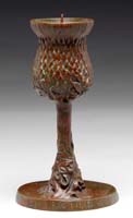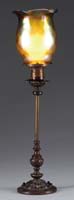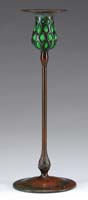 REPRODUCTION TIFFANY CANDLESTICK Cast bronze candlestick has heavy cast root foot with long slender riser and openwork candle cup. Finished in bright gold patina. Stamped on the underside “1303” with a spurious crudely stamped Tiffany Studios New York. SIZE: 17-3/4″ t. CONDITION: Candle cup was designed for blown out glass insert, glass is missing. 5-65255 (100-300)