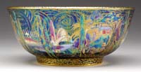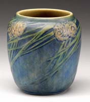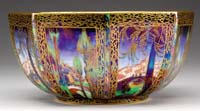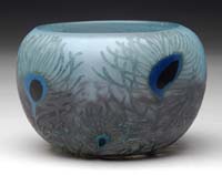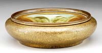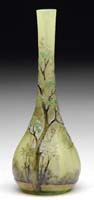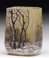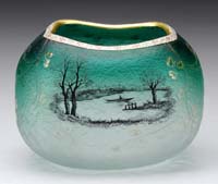 DAUM NANCY CAMEO ROSE BOWL Dark green trees against an orange mottled background of sky and lake. Cameo signature on the side “Daum Nancy”. SIZE: 2-1/2″ t. CONDITION: Very good to excellent. 5-65079 (300-500)
