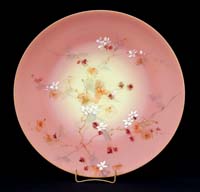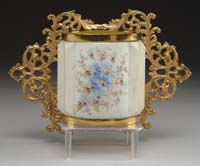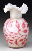 DECORATED BURMESE FAIRY LAMP Fairy-size dome with Prunus pattern décor resting in a Burmese shade cup marked “S. Clarke Patent Trademark Fairy”. SIZE: 5-1/4″ t. CONDITION: Very good to excellent. 5-65491 (500-750)