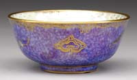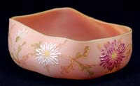 LEGRAS CAMEO & ENAMELED BOWL Purple cameo and enameled leaves, berries and branches on a textured pale salmon background. Cameo and enameled “Legras” signature on the side. SIZE: 5-3/4″ t x 7-3/4″ dia. CONDITION: Rim ground flat, possibly original, with several chips on the interior rim. 3/4″ tool-mark scratch to interior rim, otherwise good. 5-63568 (300-500)