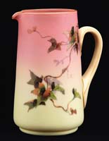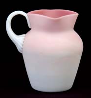 DAUM NANCY MINIATURE PITCHER Daum pitcher is decorated with cameo floral decoration on front and back and is done against an acid textured pink background and is further enhanced with gold gilt highlights. Signed on the underside in gold gilt “Daum Nancy”. SIZE: 3-1/4″ t. CONDITION: Neck and handle have been broken and repaired. 5-64946 (50-100)