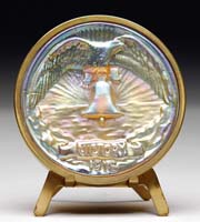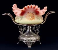 MIRRORED BURMESE STANDARD FAIRY LAMP WITH BUD VASES R-681 (similar). Fairy-size dome shade resting on a Burmese shade cup sitting in a footless bowl surrounded by six Burmese bud vases mounted in a metal holder which is attached to an 8-1/2″ dia mirrored plateau with beveled edge. Burmese lamp cup is marked “S. Clarke Patent Trademark Fairy”. CONDITION: The three legged bowl which holds the shade and shade cup has been replaced. All glass appears to be good. 5-65512 (1,000-1,500)