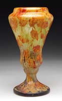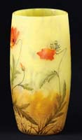 DAUM NANCY CAMEO & ENAMEL VASE Brightly colored red bellflowers and green leaves against a shaded yellow mottled to mauve mottled background. Pretty colored powders on the foot. Cameo signature on the side “Daum Nancy”. SIZE: 10-1/4″ t. CONDITION: Restoration to probable chips on the foot rim, otherwise good. 5-64944 (1,000-2,000)