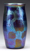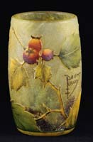 LEGRAS CAMEO VASE Frosted glass with amethyst cameo decoration of leaves, berries and stems. Signed on side of vase in cameo relief “Legras”. SIZE: 14″ t. CONDITION: Very good to excellent. 5-65404 (1,000-1,500)